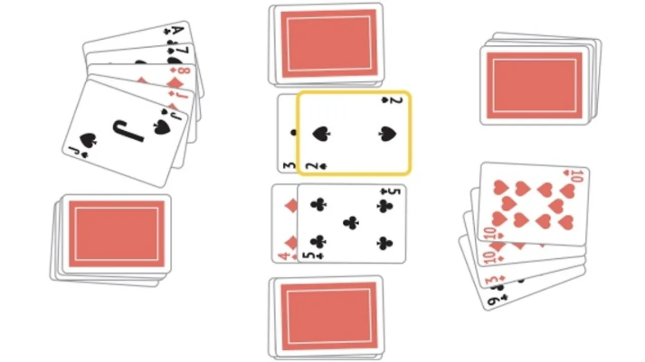 کارتهای باقیمانده را به 4 دسته در یک ردیف در وسط میز، بین خود و حریفتان تقسیم کنید. ترتیب قرار دادن کارتها از چپ به راست به شرح زیر است: