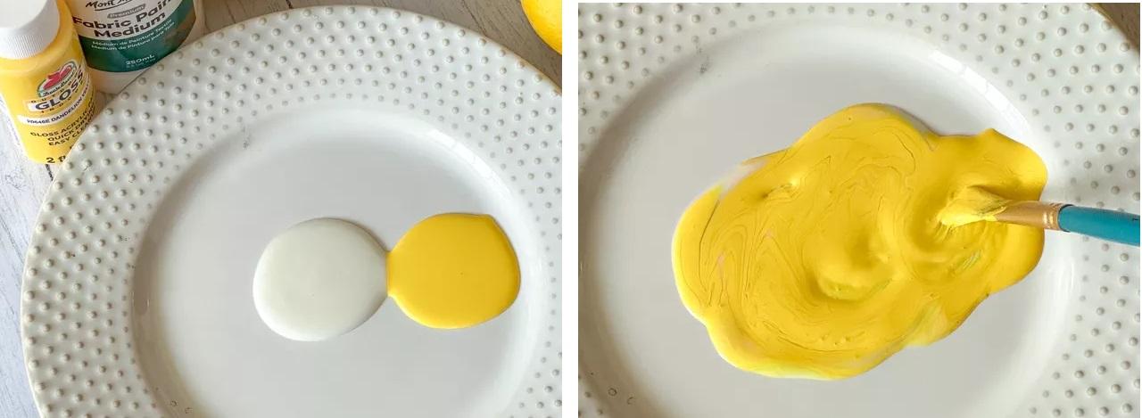 مقدار مساوی از رنگ اکریلیک و مدیوم رنگ پارچه را با هم مخلوط کنید. استفاده از مدیوم پارچه هنگام رنگآمیزی روی پارچه ضروری است، زیرا بدون آن، پارچهی زیبای شما به سرعت خشک و سفت شده و ترک برمیدارد و جلوهی نهایی خراب میشود.