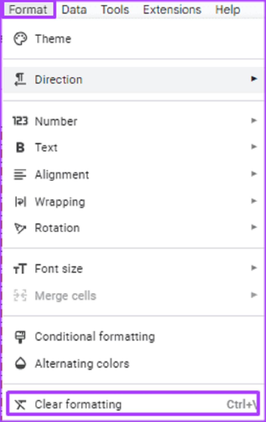 مرحله 4: در نوار ابزار گوگل شیت، روی Format کلیک کنید و Clear Formatting را انتخاب کنید. با این کار قالب بندی داخل سلول حذف می شود.