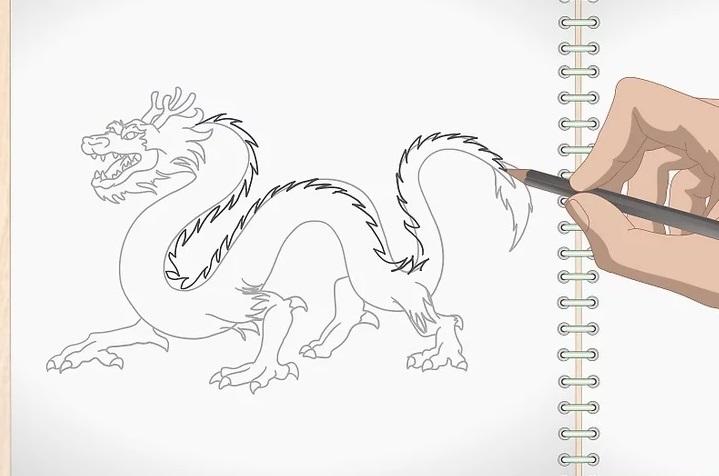 • در صورت تمایل می‌توانید موهایی که از وسط پشت اژدها می‌گذرد را ترسیم کنید.