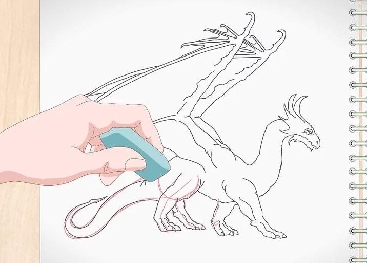 از پاک کن خود برای پاک کردن هر علامتی که بخشی از بدن اژدهایتان نیست، مانند دایره ها یا خطوط وسط پاها، استفاده کنید. با دقت کار کنید تا هیچ یک از طرح کلی اژدها را پاک نکنید، در غیر این صورت باید بخش ها را دوباره ترسیم کنید.